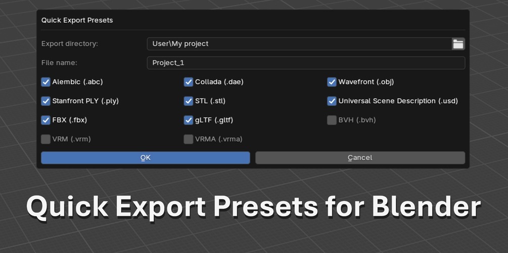 Quick Export Presets for Blender is the ultimate tool for streamlining your export process. With just a few clicks, you can quickly export your scene to multiple formats, including Alembic, Collada, OBJ, STL, FBX, USD, and more. Perfect for artists and game developers who need to quickly export their assets without navigating complex export menus.
